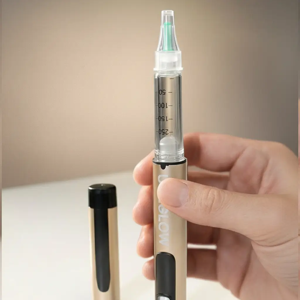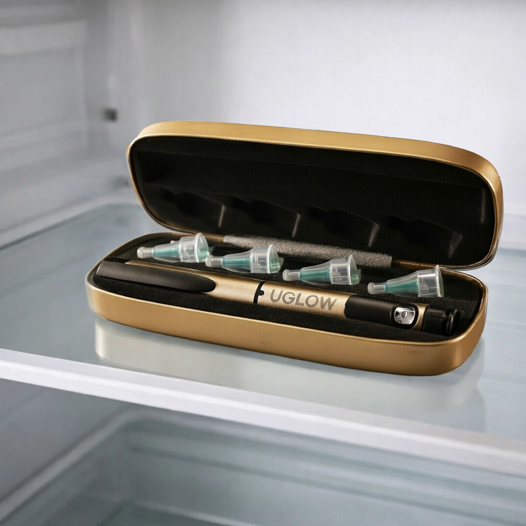 Crafted with a sleek metal body, smooth mechanism, and medical grade needle tips — ÜGLOW feels premium because it is premium.